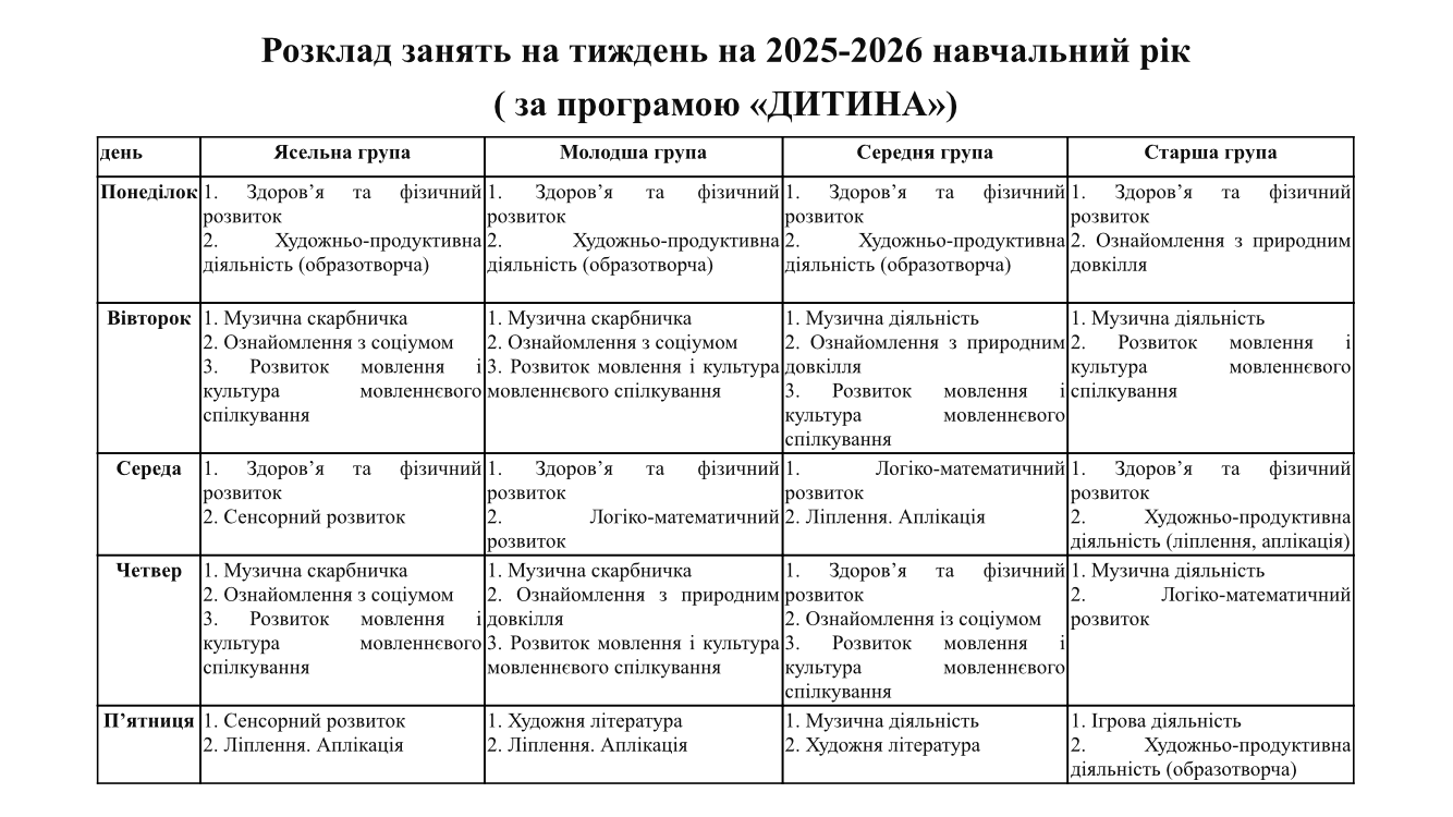 В закладі функціонують 4 групи: 1 група раннього віку та 3 групи дошкільного віку.